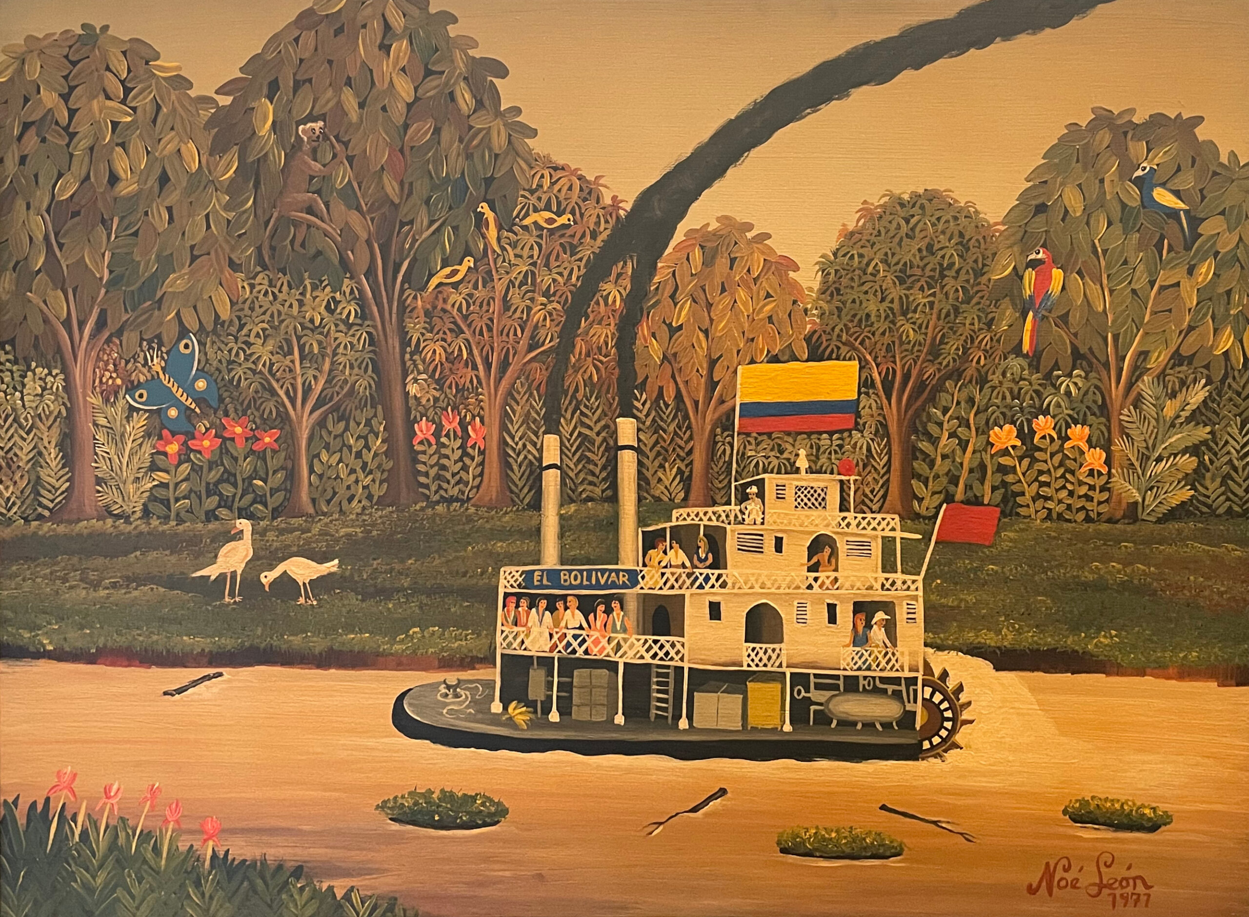 “El Bolívar”, pintado por Noé León en 1977, es una obra maestra del arte primitivo costumbrista colombiano que rinde homenaje al esplendor de los ríos y la vida fluvial del Caribe. Ejecutada en acrílico sobre madera, esta escena colorida y nostálgica muestra un emblemático vapor de ruedas —“El Bolívar”— surcando un río rodeado de vegetación exuberante, aves tropicales y mariposas, en un entorno que respira historia y naturaleza viva.