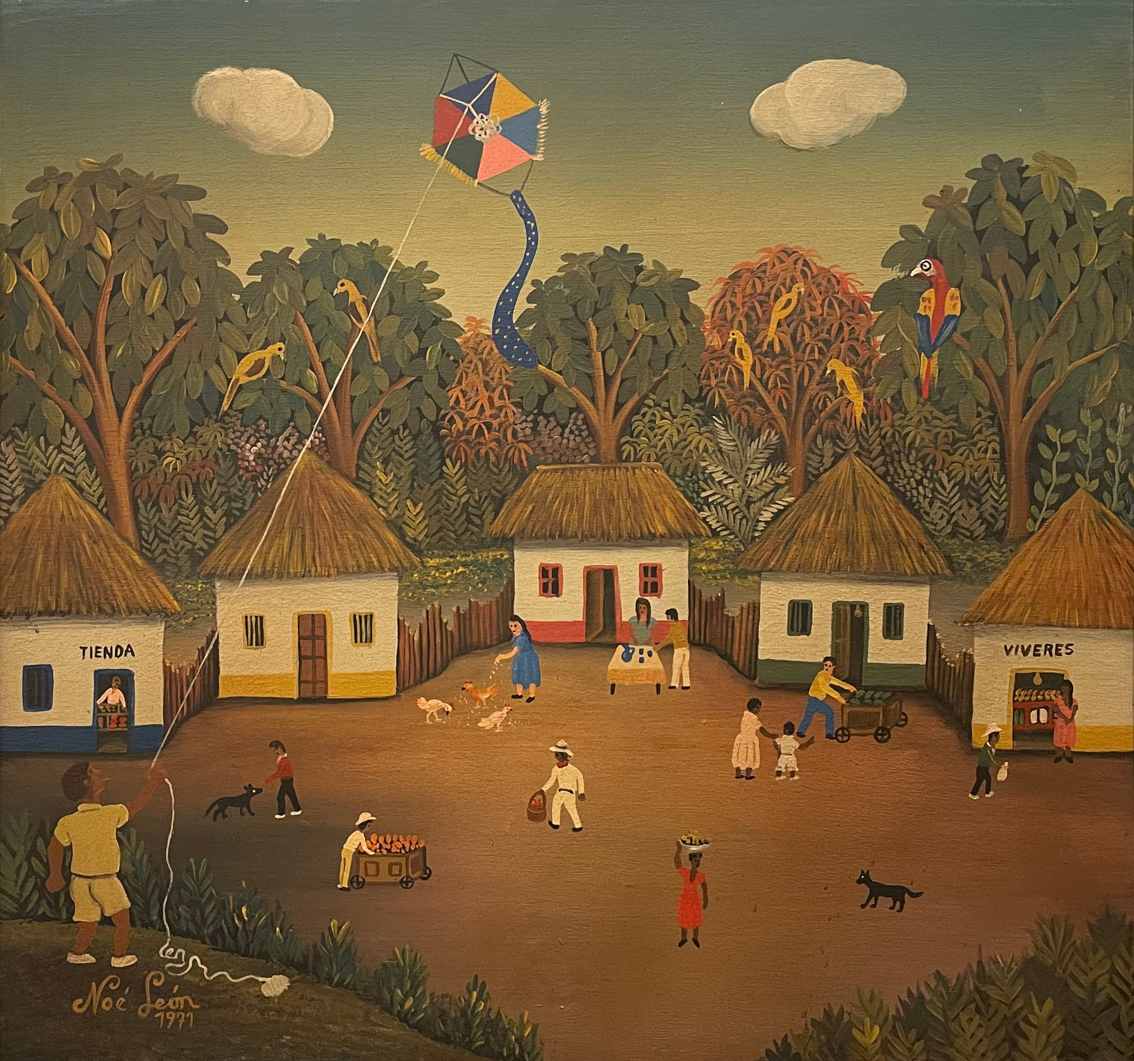 El paisaje está enmarcado por árboles y casas de techo de palma, con establecimientos populares como la “Tienda” y la venta de “Víveres”, mientras niños juegan, adultos comercian y un cometa se alza en el cielo. En la parte inferior izquierda, la obra lleva la firma del artista y la fecha 1971. Su buen estado de conservación y su autenticidad como pieza única la convierten en una joya para coleccionistas de arte latinoamericano y entusiastas de la estética naïf.